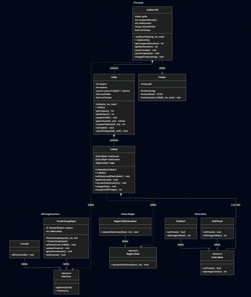 Le but de ce projet était de concevoir un programme capable de faire évoluer une population de cellules de manière autonome, selon des règles précises de naissance et de mort. Le véritable défi ne résidait pas seulement dans l’algorithme, mais dans la création d’une architecture logicielle modulaire respectant scrupuleusement les principes SOLID et intégrant des Design Patterns avancés.